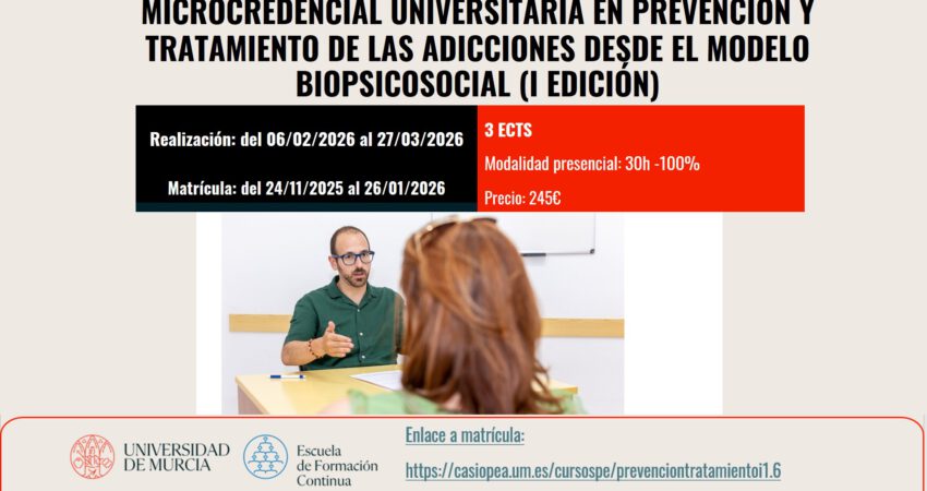 MICROCREDENCIAL UNIVERSITARIA EN PREVENCIÓN Y TRATAMIENTO DE LAS ADICCIONES DESDE EL MODELO BIOPSICOSOCIAL (I EDICION) ¿Eres licenciado/a, graduado/a o estudiante de Psicología y quieres especializarte en un área de alta demanda profesional?Esta formación te ofrece herramientas actualizadas para comprender y…
